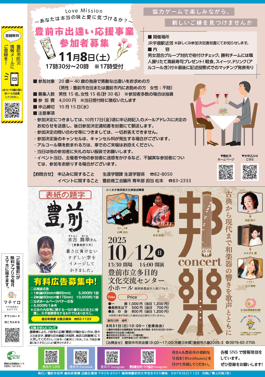 その他 広報豊前 令和7年9月号 裏表紙 32/32 前の記事 発行日 : 2025年08月31日 自治体名 : 福岡県豊前市 広報紙名 : 広報豊前 令和7年9月号 Tweet シェアする 広報豊前 令和7年9月号 31面