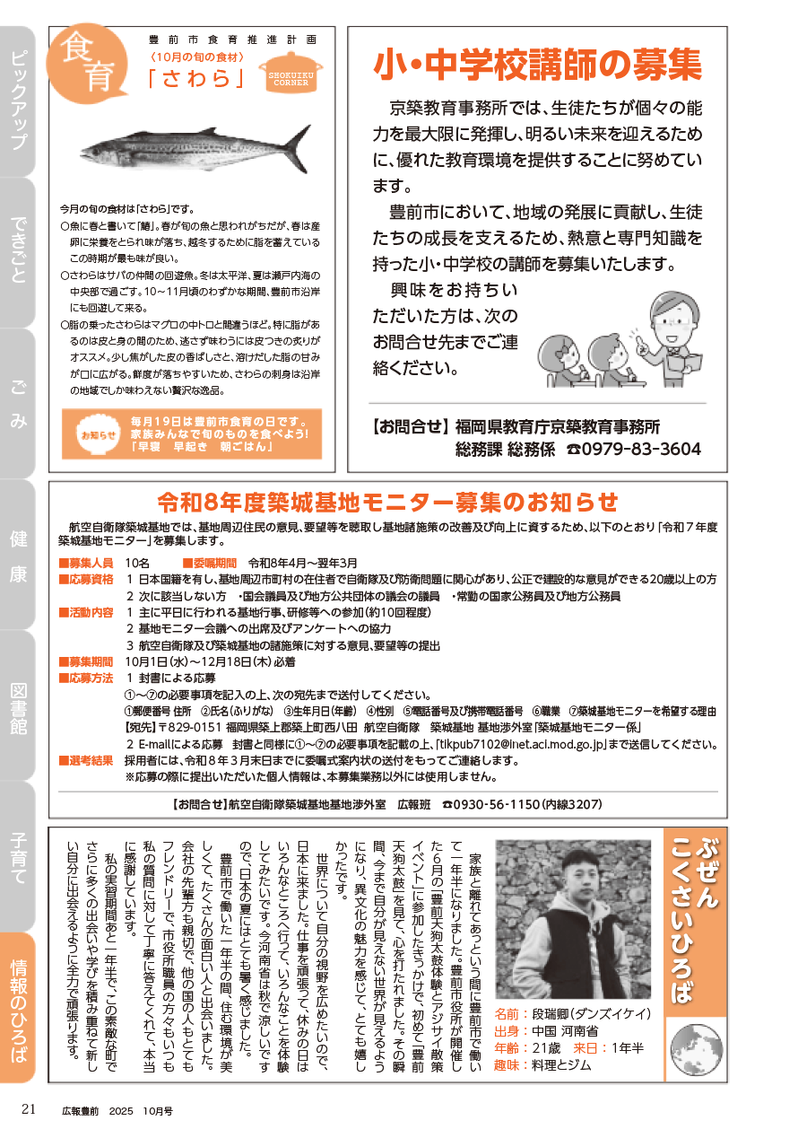その他 広報豊前 令和7年10月号 21面 21/26 前の記事 次の記事 発行日 : 2025年09月30日 自治体名 : 福岡県豊前市 広報紙名 : 広報豊前 令和7年10月号 Tweet シェアする 広報豊前 令和7年10月号 20面 広報豊前 令和7年10月号 22面