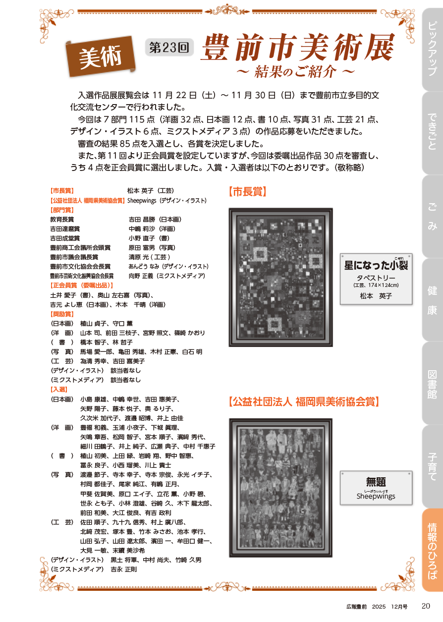 イベント 広報豊前 令和7年12月号 20面 20/26 前の記事 次の記事 発行日 : 2025年11月30日 自治体名 : 福岡県豊前市 広報紙名 : 広報豊前 令和7年12月号 Tweet シェアする 広報豊前 令和7年12月号 19面 広報豊前 令和7年12月号 21面