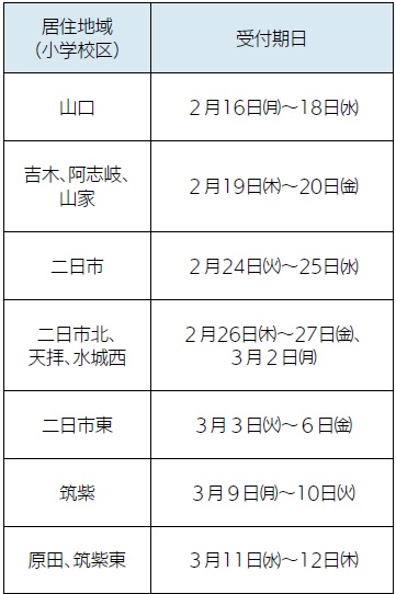 申告会場の混雑緩和のため、居住地域(小学校区)ごとに受付期日を定めています。都合が合わない場合は、他の期日に申告してください。(事前連絡不要)