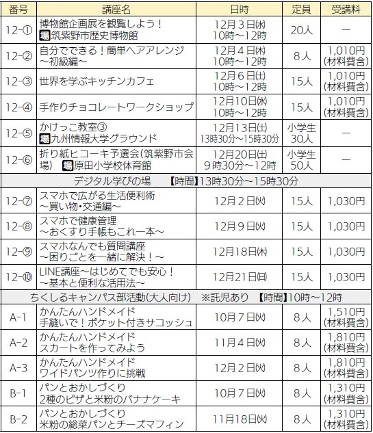 申込方法:ハガキまたは市ホームページから「(1)受講希望の講座名(番号)(2)住所(3)氏名(4)電話番号」をお知らせください。定員を超えた場合は抽選。