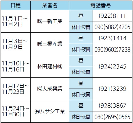 くらし 緊急漏水時(きんきゅうろうすいじ)の水道当番業者(すいどうとうばんぎょうしゃ) 39/47 前の記事 次の記事 発行日 : 2025年11月01日 自治体名 : 福岡県筑紫野市 広報紙名 : 広報ちくしの 令和7年11月号 問合せ:上下水道工務課 Tweet シェアする 証明書コンビニ交付サービス お知らせコーナー「無料相談」