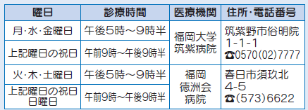 子育て 筑紫地区小児救急診療体制 38/46 前の記事 次の記事 発行日 : 2025年12月01日 自治体名 : 福岡県大野城市 広報紙名 : 広報「大野城」 令和7年12月1日号 ※上記診療時間内でも状況により、小児科医ではない救急診療部の医師が診療する場合があります。 ※受け付けは全て午後9時までですが、病院の状況によっては早めに終了する場合があります。 ※対象年齢については、事前に病院へ問い合わせてください。 医療機関を受診すべきか迷ったときは: 救急医療情報センター【電話】471-0099または【電話】#7119 小児救急医療電話相談【電話】#8000 Tweet シェアする 休日当番医 歯科休日急患診療