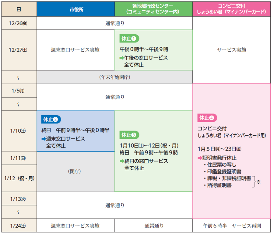 法律に基づき、住民票や税などを取り扱うシステムの大規模な改修のため、下表(1)~(4)の日程で証明書発行など市民サービスが一時休止となります。
