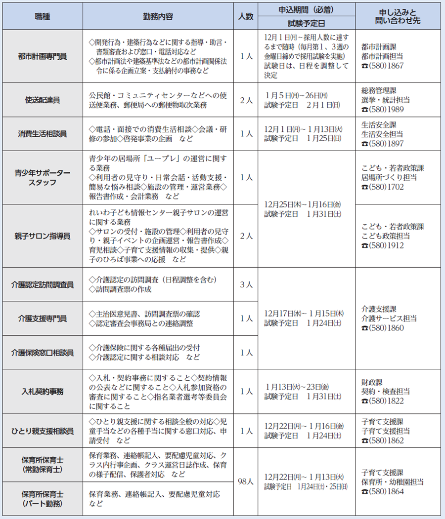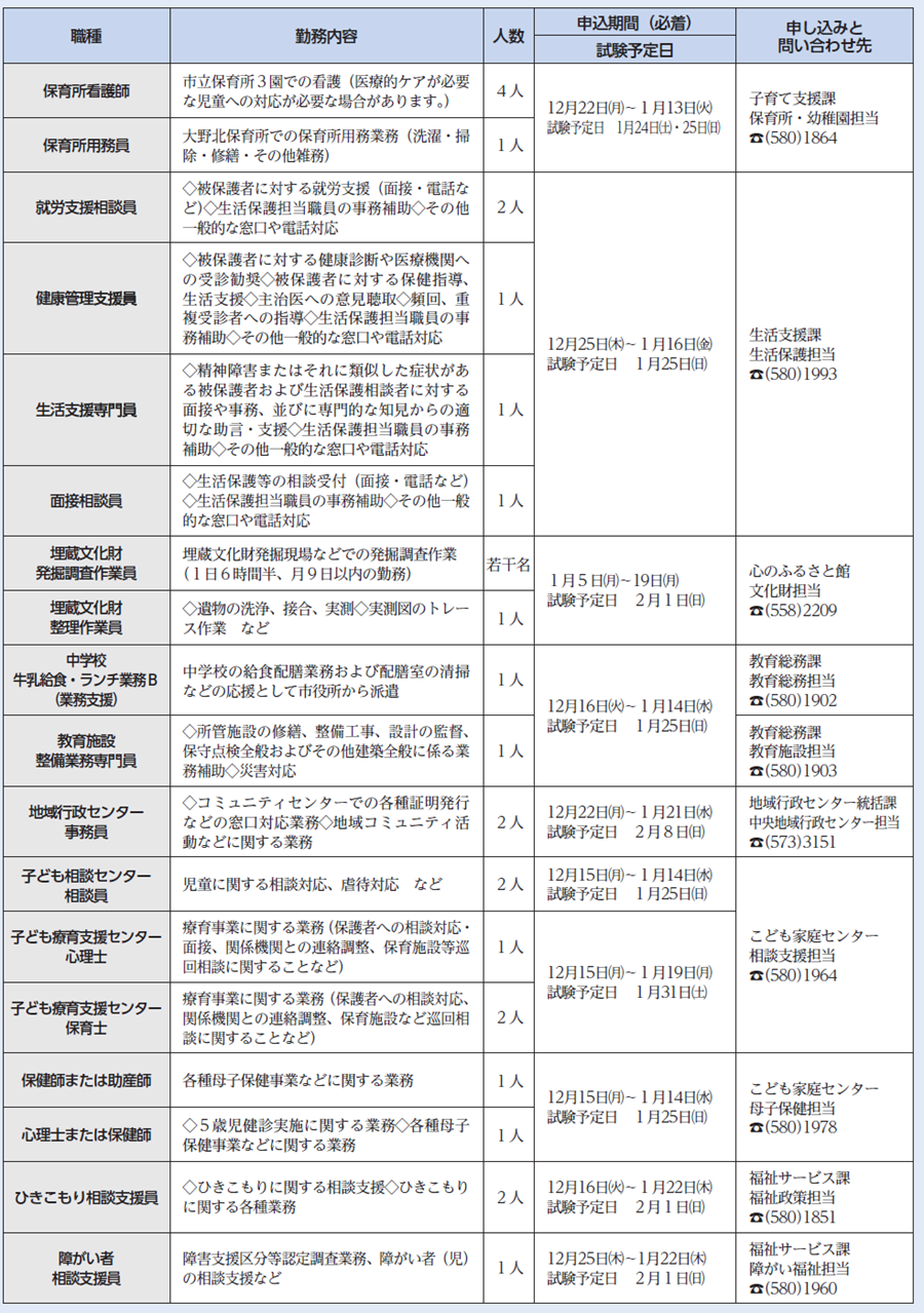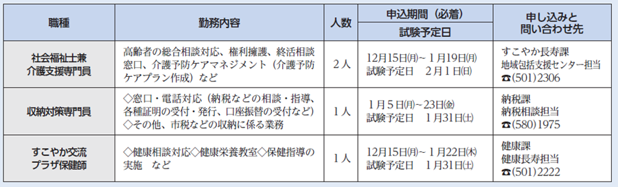 詳しくは、市ホームページなどで確認するか、各職種の担当課へ問い合わせてください。