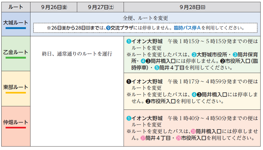 変更するルートには、臨時バス停を設けますので、注意してください。