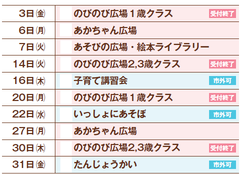 ・1歳クラス 4日(火)、14日(金)