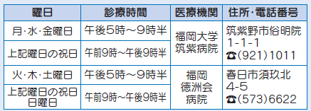子育て 筑紫地区小児救急診療体制 48/55 前の記事 次の記事 発行日 : 2025年09月15日 自治体名 : 福岡県大野城市 広報紙名 : 広報「大野城」 令和7年9月15日号 ※上記診療時間内でも状況により、小児科医ではない救急診療部の医師が診療する場合があります。 ※受け付けは全て午後9時までですが、病院の状況によっては早めに終了する場合があります。 ※対象年齢については、事前に病院へ問い合わせてください。 医療機関を受診すべきか迷ったときは: 救急医療情報センター【電話】471-0099または【電話】#7119 小児救急医療電話相談【電話】#8000 Tweet シェアする 休日当番医 歯科休日急患診療
