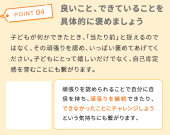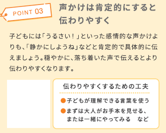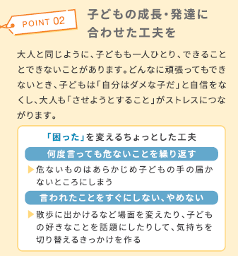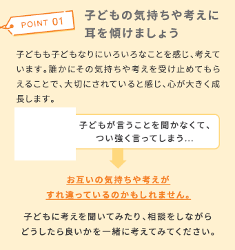 子どもの話を聞く、時間をかけて待つなどすることで、お互いに心地よい関係を育むことができます。