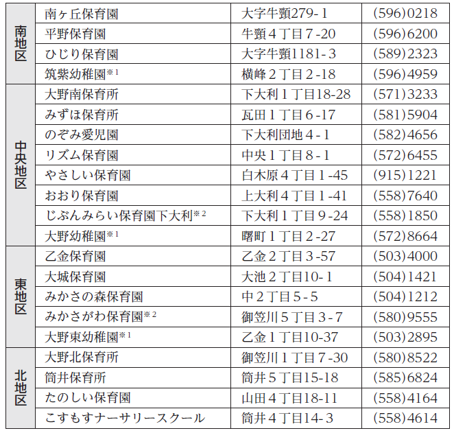 ※2小規模保育事業所(じぶんみらい保育園下大利は1~2歳児が対象)