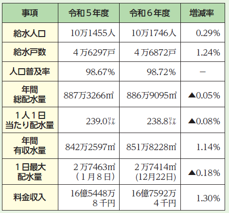 令和6年度の水道事業では、年間有収水量851万8228立方メートル(前年度比1.14%増)を各家庭や企業に給水し、料金収入は、16億7592万4千円でした。