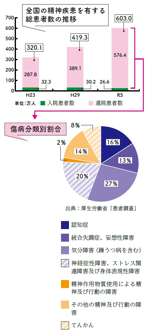 近年、精神疾患にかかる人は増加傾向にあり、厚生労働省によると、生涯を通じて5人に1人は何かしらのこころの病気にかかるといわれています。また、精神疾患は5大疾病の一つとも言われており、特別な人がかかるものではなく、ストレスなどが積み重なることがきっかけとなって、誰でもかかる可能性があります。