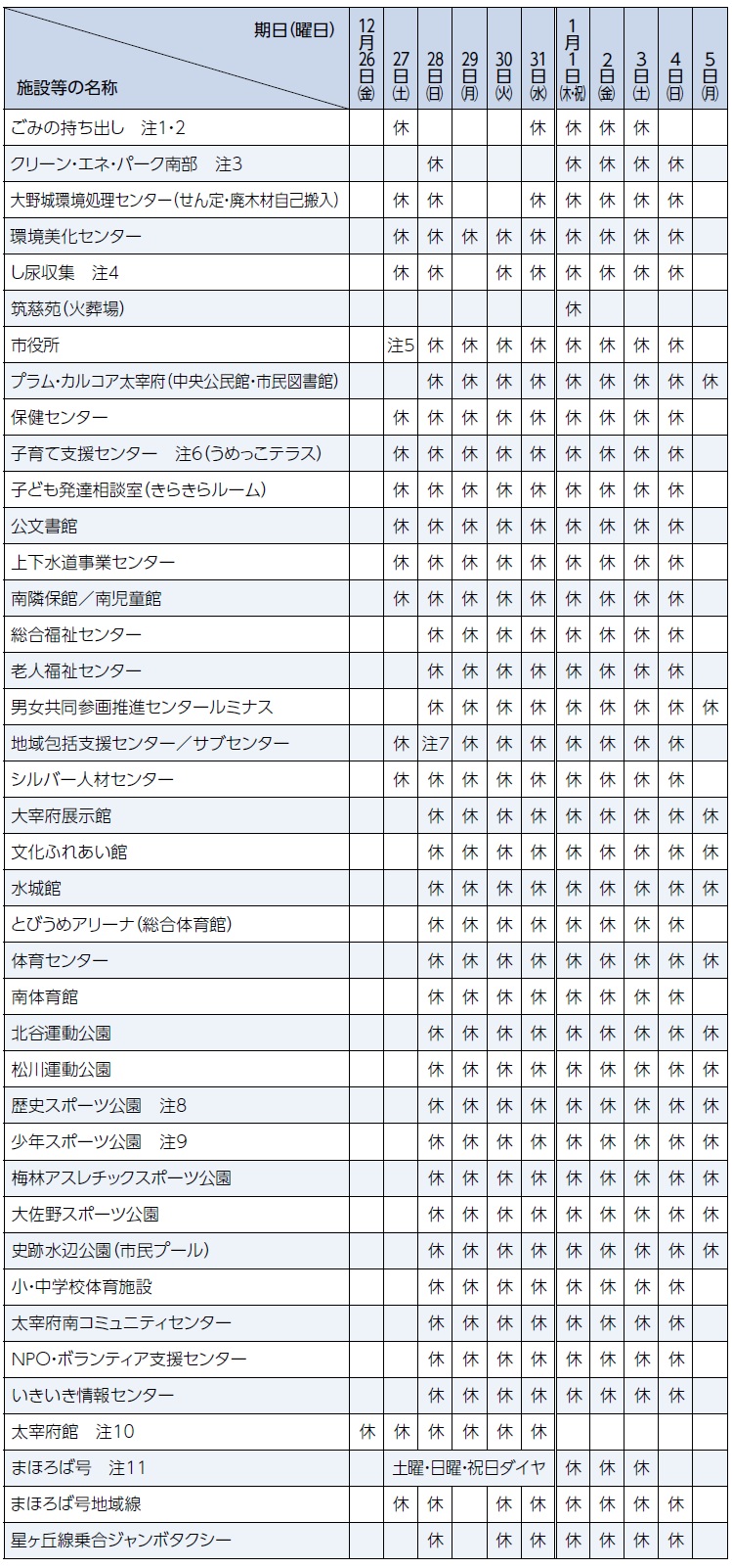 注1)「粗大ごみ」の収集予約12/27(土)~1/4(日)休み、1/7(水)、1/8(木)の収集は12/25(木)までに予約。1/9(金)、1/11(日)、1/12(月)の収集は1/5(月)までに予約。1/13(火)の収集は1/6(火)までに予約。
