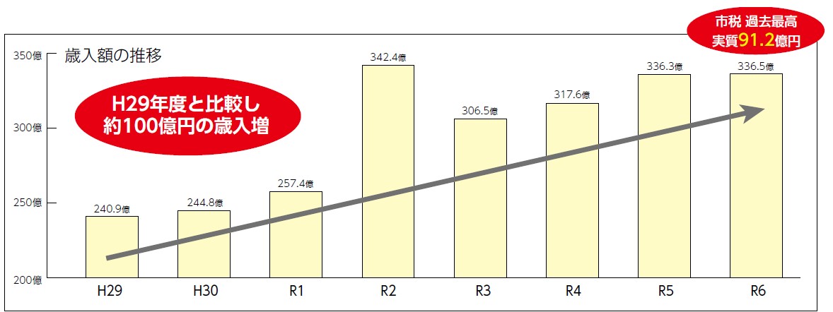 令和6年度の市税は、定額減税の影響を除くと91.2億円、3年連続で過去最高でした。個人住民税や固定資産税等が増加しており、要因として、全国的な賃金上昇や、本市が推進している「全世代居場所と出番構想」による働き世代の人口増加、新築家屋の増加といった動きが挙げられます。また、物価高騰の影響により地方消費税交付金が、令和の都太宰府ふるさと納税基金などの積極的な活用により繰入金が増加しました。