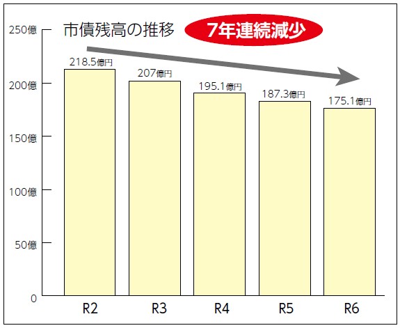 市の借金にあたる市債残高は、令和6年度末時点で175.1億円となっています。小中学校の屋内運動場へのエアコン設置などを目的に新たな借入を行いましたが、借入額を上回る返済を続けているため、ここ数年は残高が減少傾向にあります。後年度に交付税措置されるものが約70%、償還に対し補助金等の交付があるものが約11%を占めており、実質の負担割合は約19%(約32億5,400万円)となります。