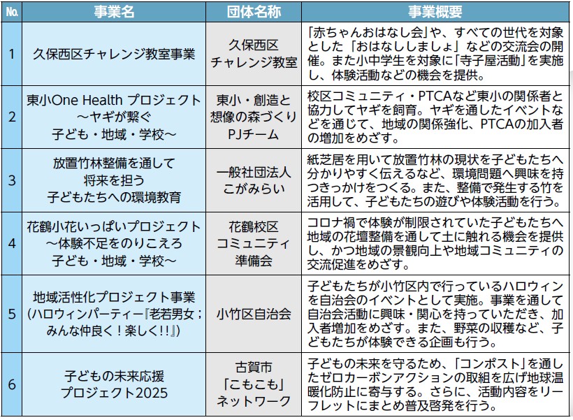 5月に公募した「令和7年度古賀市コミュニティ活動補助金」について、採択された6つの事業を紹介します。