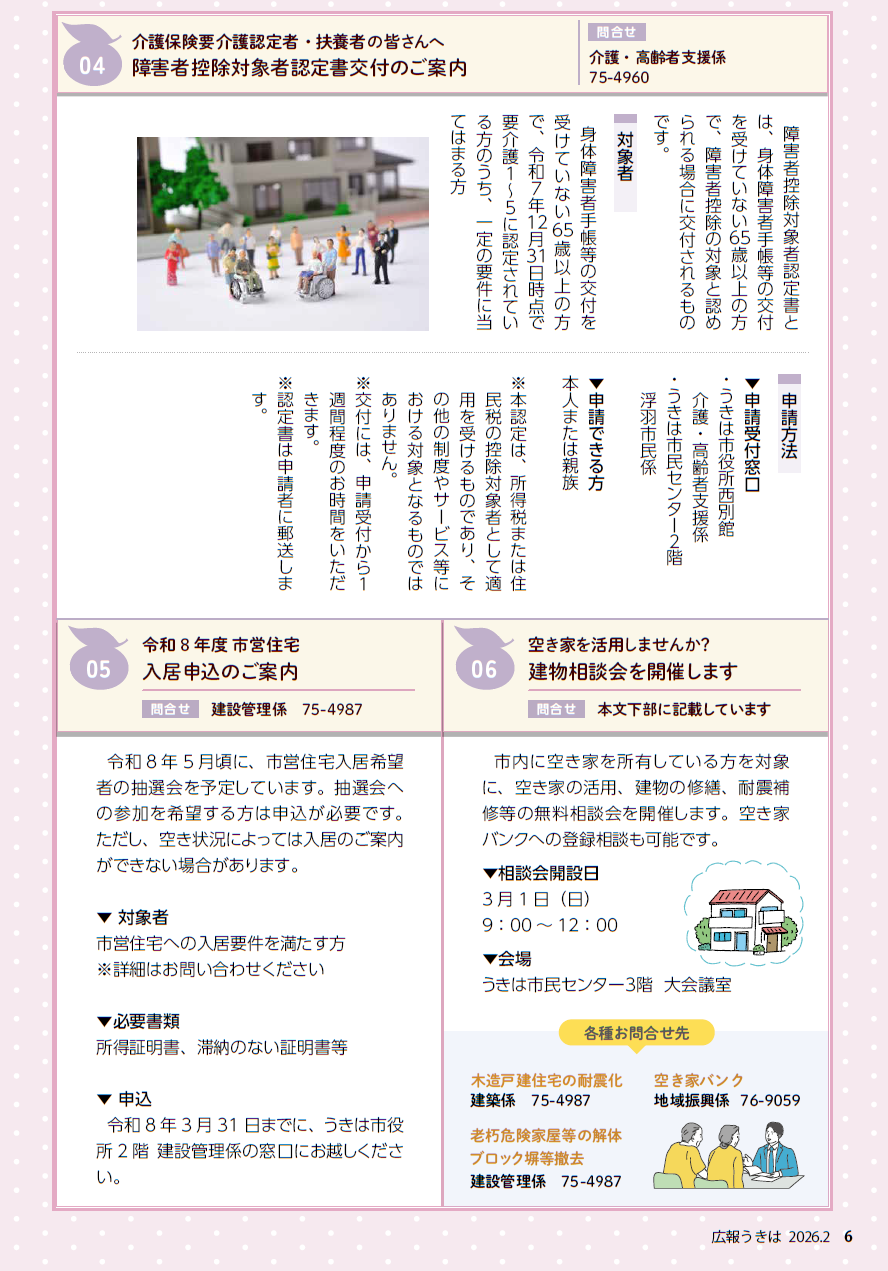 くらし 広報うきは 2026年2月号 P.6 6/27 前の記事 次の記事 発行日 : 2026年02月01日 自治体名 : 福岡県うきは市 広報紙名 : 広報うきは 2026年2月号 No.452 Tweet シェアする 広報うきは 2026年2月号 P.5 広報うきは 2026年2月号 P.7