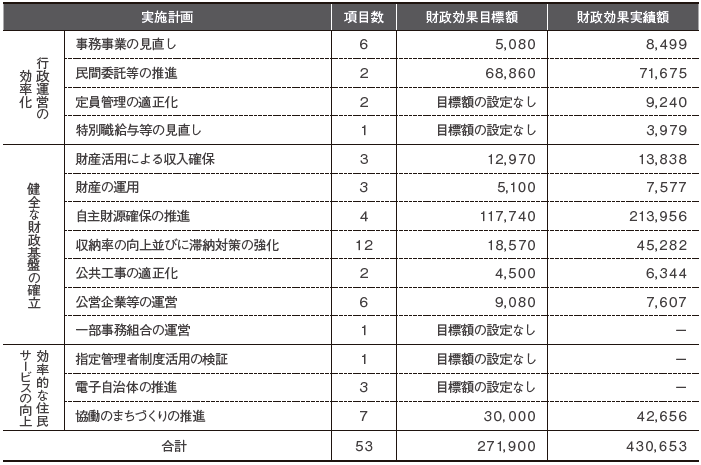 集中改革プランでは、三つの基本方針のもと、全五十三項目について、取組内容や財政効果目標額を定めています。