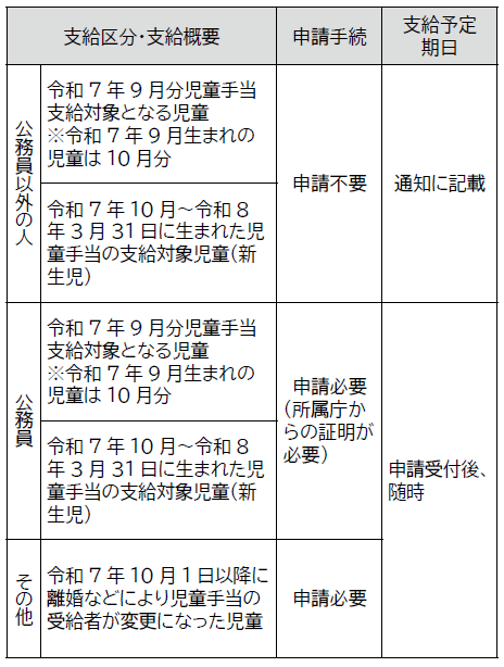 所属庁から児童手当を受給している公務員や、10月1日以降に離婚などにより新たに児童手当の受給者となった人は申請手続きが必要です。詳細は市HPをご確認ください。