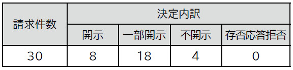 令和6年度の請求件数は30件(令和5年度は18件)で、決定内訳は下表のとおりです。また、開示などの決定に対する審査請求は1件(令和5年度は0件)でした。