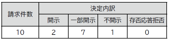 この制度では、本人の個人情報に対し、開示・訂正・利用停止の請求が保障されています。令和6年度の個人情報の開示請求件数は10件(令和5年度は10件)で、決定内訳は下表のとおりです。なお、個人情報の訂正・利用停止請求はありませんでした。また、開示などの決定に対する審査請求は1件(令和5年度は0件)でした。