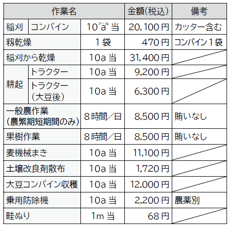 朝倉市郡(朝倉市・筑前町・東峰村)の秋季標準農作業賃金が、下表のとおり決定しました。この賃金表は、農作業を受託または委託した場合の目安となるものです。