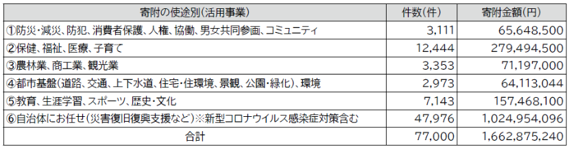 寄附金は、寄附者の意向で市が掲げる6項目のまちづくり事業の具体的施策に活用します。今後も皆さんから寄せられた思いを大切に、まちづくりを進めていきます。