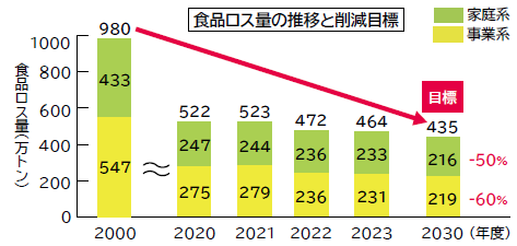 2025年3月に閣議決定された「食品ロスの削減の推進に関する基本的な方針」では、2030年度までに2000年度比で家庭系食品ロス量を50%、事業系食品ロス量を60%削減させることを目標としています。