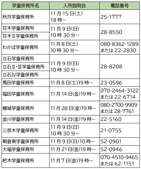 各学童保育所で入所説明会が行われます。詳しくは、各学童保育所にお問い合わせいただくか、市HPでご確認ください。