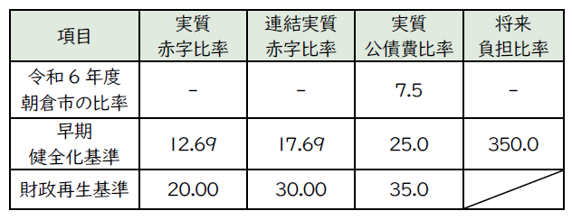 これらの4指標には早期健全化基準と財政再生基準が設けられており、この基準を超えると、財政健全化団体、財政再生団体と判断され、財政指標を改善するための計画を策定しなければなりません。朝倉市(令和6年度)はどの比率も基準を下回っています。