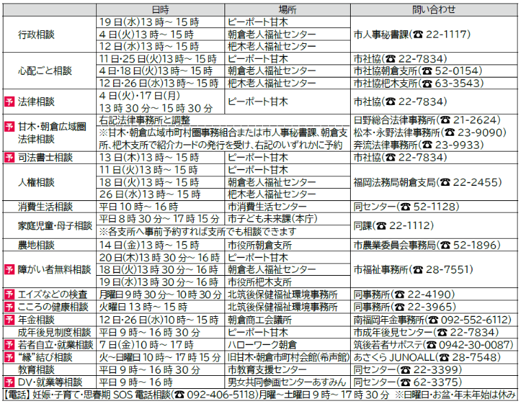 費用や申込の記載がないものは無料・申込不要です。相談は秘密厳守します。