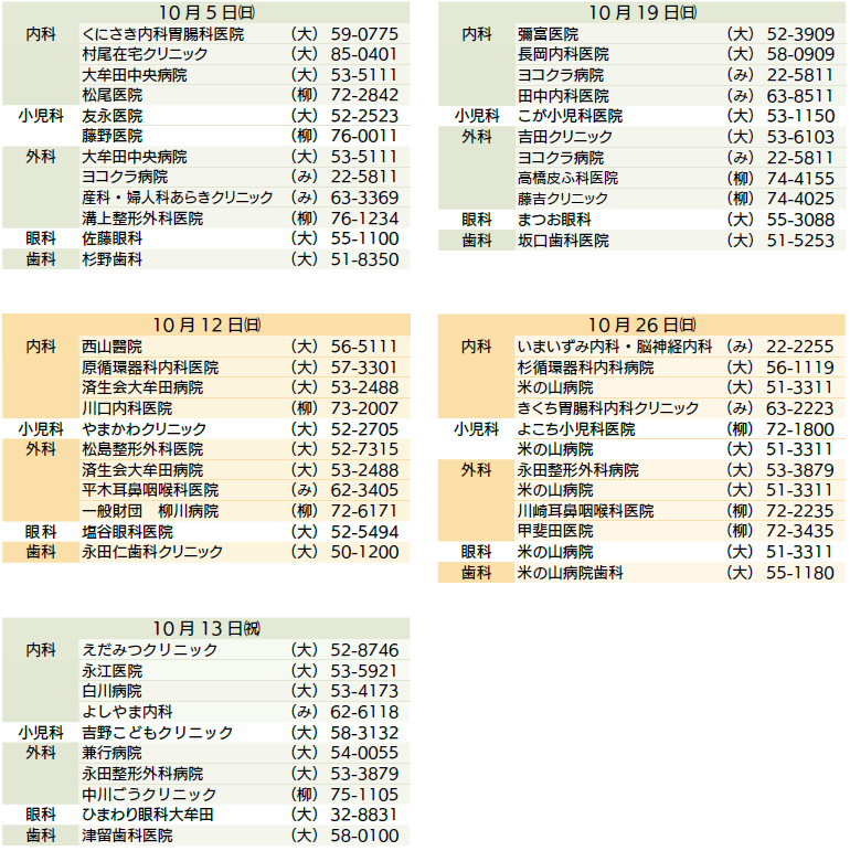 休日当番医診療時間は9時〜17時(救急指定病院は除く)ですが、受診の際は電話で確認ください。