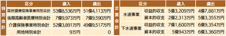 特定の収入で特定の事業を行う特別会計と、民間企業と同じような経理をする企業会計の決算状況です。特別会計とは、国民健康保険や介護保険など事業目的を限定し、一般会計と区別しています。