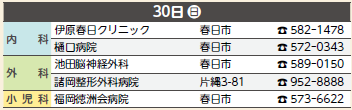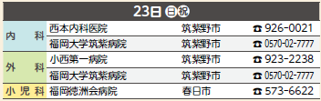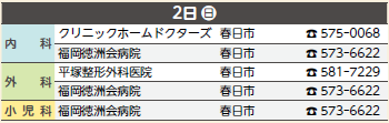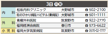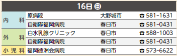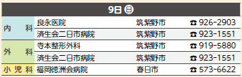 ※広報紙掲載後に当番医が変更になることもあります。受診前にもう一度、医療機関に電話でお確かめください。