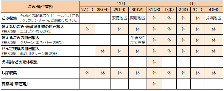し尿収集予定日が、休みにあたる地域は年内に収集する予定です。臨時で、し尿収集が必要な場合は事前に那珂川事業センターへ連絡ください。