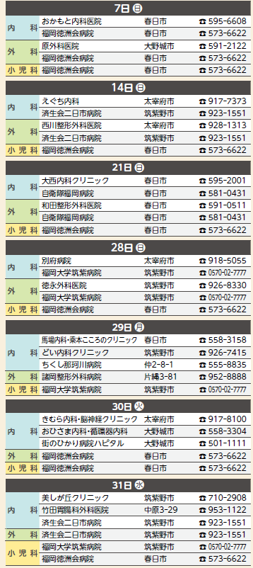 ※広報紙掲載後に当番医が変更になることもあります。受診前にもう一度、医療機関に電話でお確かめください。