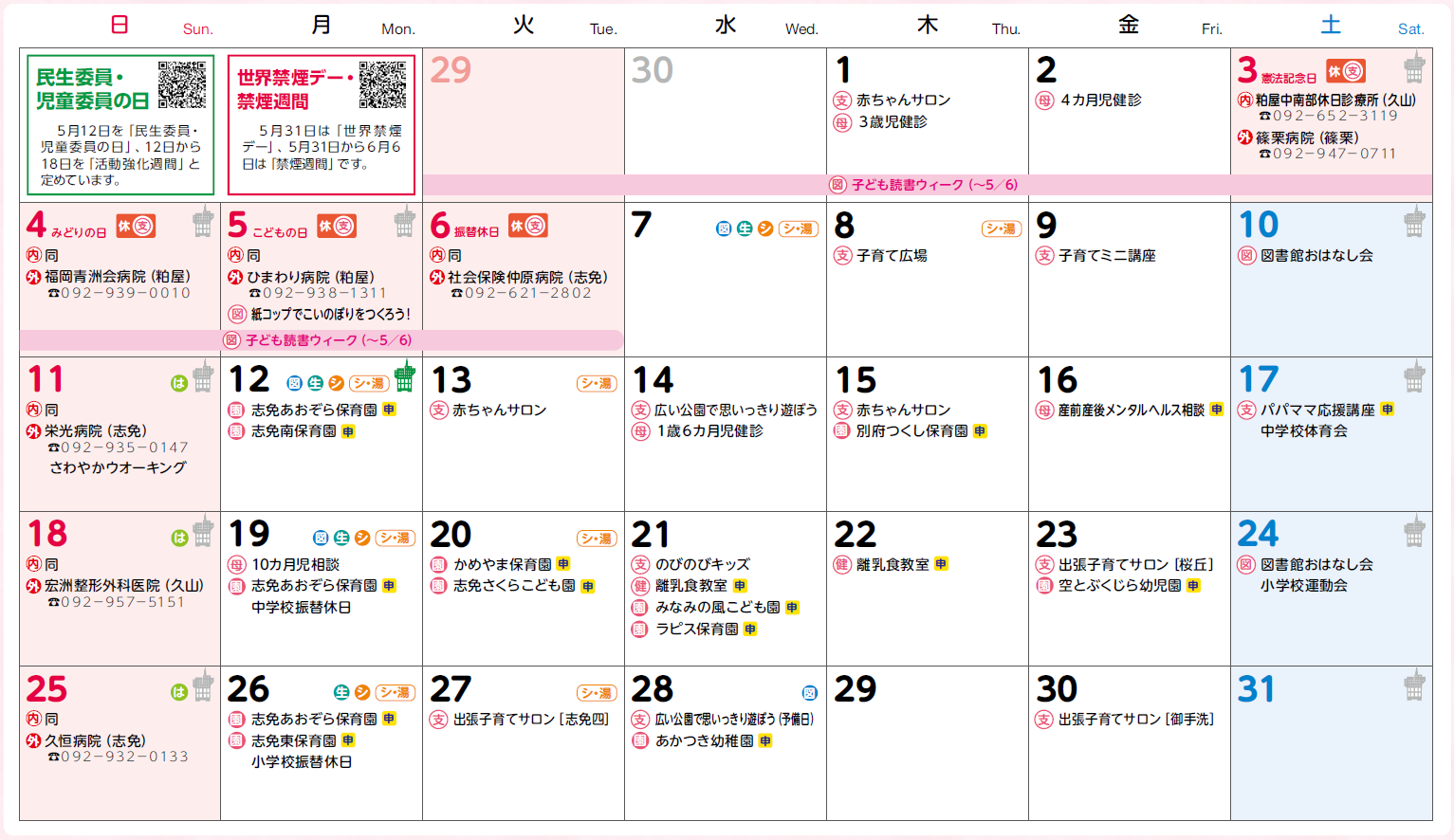子育て 子育て情報 – にっこりカレンダー 11/33 前の記事 次の記事 発行日 : 2025年05月01日 自治体名 : 福岡県志免町 広報紙名 : 広報しめまち 2025年5月号 ■2025年5月(May) ■納税など 固定資産税:1期(前納) 軽自動車税:全 保育料:5月分 副食費:5月分 上下水道料金:5月分 ■福岡県救急医療電話相談 (※本紙をご覧ください) 〇説明 〇休館日等 問合せ Tweet シェアする 2025年(令和7年)5月 皐月 May 子育て情報 – イベント