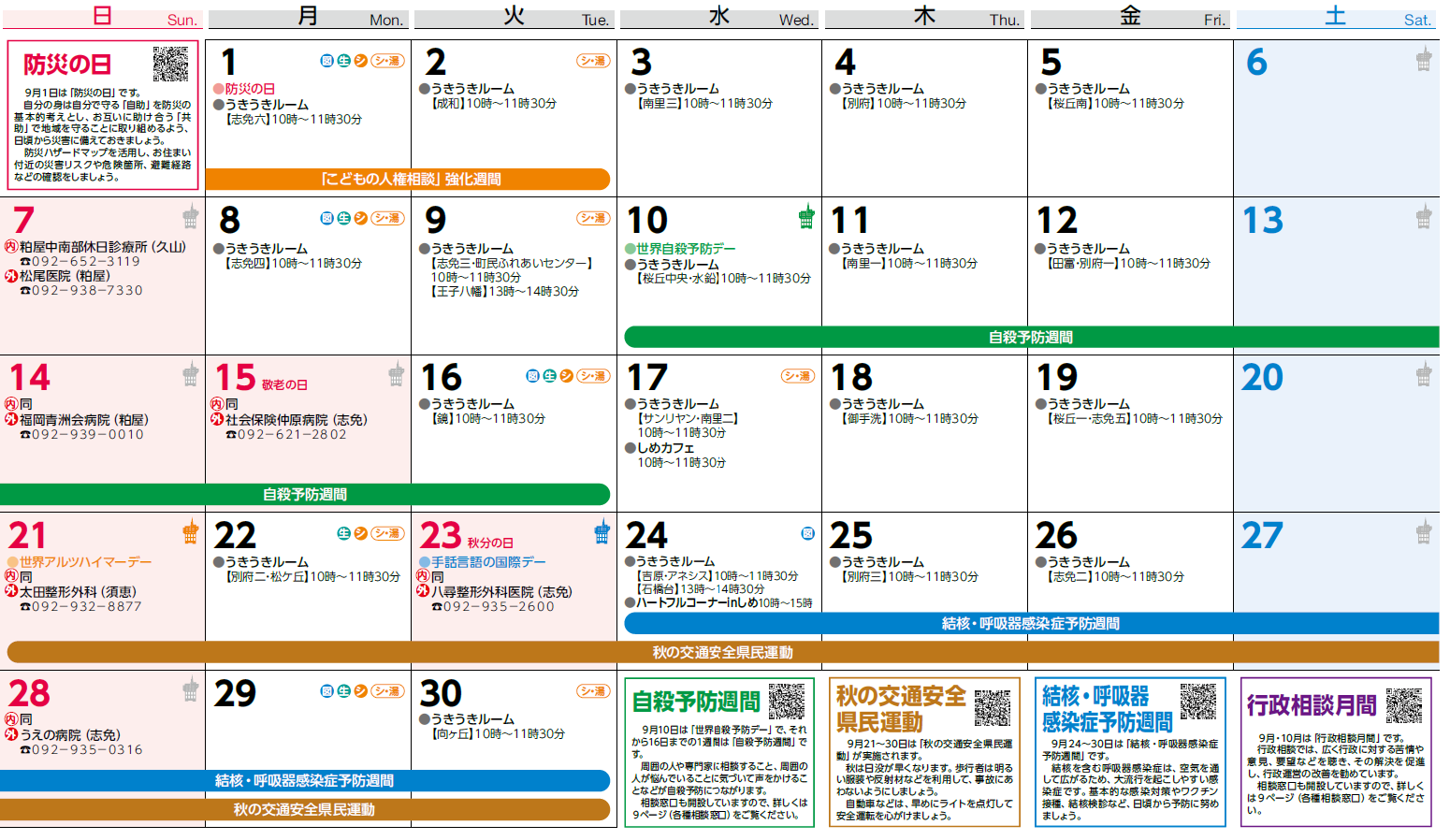 くらし 2025年(令和7年)9月 長月 September 8/32 前の記事 次の記事 発行日 : 2025年09月01日 自治体名 : 福岡県志免町 広報紙名 : 広報しめまち 2025年9月号 〇納税など 町県民税:4期 固定資産税:5期 国民健康保険税:4期 後期高齢者医療保険料:3期 保育料・副食費・上下水道料金:9月分 公共下水道受益者負担金:2期 〇説明 〇休館日等 Tweet シェアする 各種相談窓口 子育て情報 – にっこりカレンダー