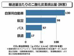 移動する時のCO2排出量は、鉄道に比べて自家用乗用車は約8倍、バスは約3倍のCO2排出量となっています。