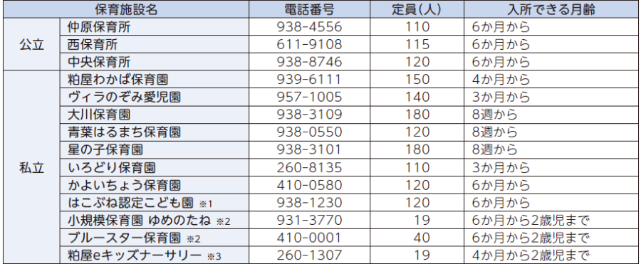 ※2 小規模保育園ゆめのたね、ブルースター保育園は2歳児までのお預かりとなり、3歳児からは連携施設「キッズドリーム幼児園(篠栗町)」でのお預かりとなります。