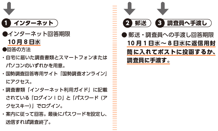 調査の方法:国から任命された「調査員」が、全ての家庭を訪問し、調査のための書類を渡します。回答はスマートフォンやパソコンからのインターネット回答か、紙の調査票に記入し、郵送で提出する方法、調査員へ手渡す方法のいずれかを選ぶことができます。