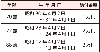 町では、70歳、77歳、88歳になる人に敬老祝金(芦屋町商工会商品券)を給付しています。今年度の給付対象者は次のとおりです。
