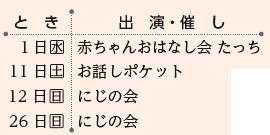 6日(月)、14日(火)、20日(月)、23日(木)、27日(月)
