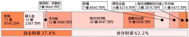 歳入額を財源別にみると、町税や使用料・手数料などの自主財源が総額の37.8%、地方交付税や国庫支出金などの依存財源が62.2%です。