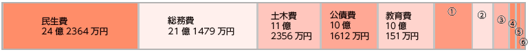 (1)衛生費…6億7560万円、(2)商工費…3億7569万円、(3)消防費…2億8106万円、(4)農林水産業費…1億2306万円、(5)議会費…1億558万円、(6)諸支出金…6827万円