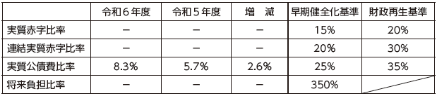 健全化判断比率のうち、1つでも早期健全化基準以上になった場合は「財政健全化計画」を定める必要がありますが、いずれの比率も基準を下回っており、町の財政は健全な状態にあると言えます(比率がマイナスの場合は「-」で表示)。
