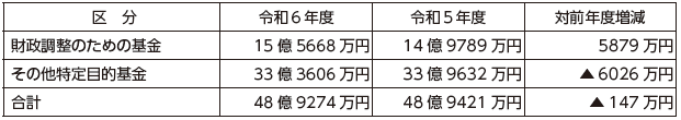 令和6年度は、前年度に引き続いて物価高騰に対応するため町独自事業を実施し、多額の財政調整基金を取り崩しましたが、今後も不測の事態に対応できる体制を整えるため、モーターボート競走事業会計からの繰入金を増額したことから、全体としてほぼ横ばいになりました。