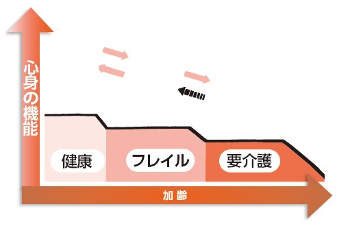 フレイルとは、年を重ね、体や心、社会的なつながりが弱くなった状態のことです。そのまま放置すると、要介護状態になる可能性があります。しかし、早めに気づいて、適切な対策をすれば健康な状態に回復できる時期でもあります。