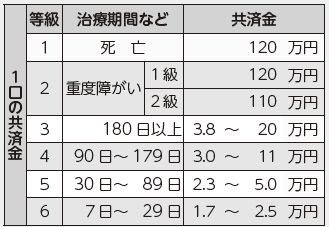 内容:1口500円の掛金で最高120万円保障。3口まで加入でき、この場合共済金は3倍額。