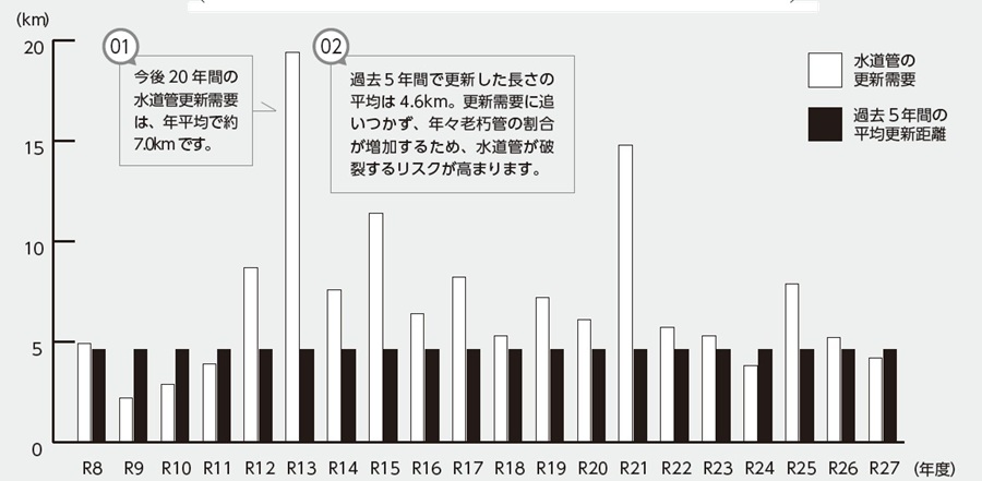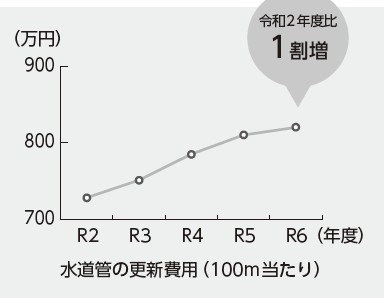 さらに、既設管の老朽化は進んでいき、水道管100m当たりの更新費用も年々上昇していることから、将来的に莫大な費用が見込まれています。今後20年間、